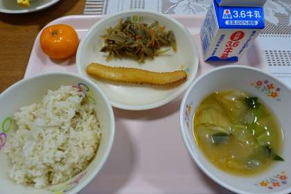 今日は、ふるさと給食ということで「沼津茶飯」です。また、「冷凍みかん」も定番です。