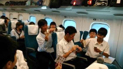 新幹線は掛川をすぎたところです。朝御飯?も食べ終わり、トランプ中です。