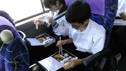 法隆寺を見学して、バスの中でお昼を食べます。珍しく法隆寺がすいていました。これから薬師寺へ向かいます。
