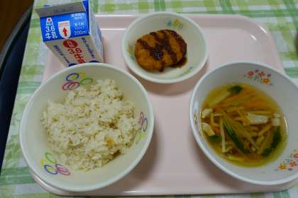 しらす干しご飯、牛乳、大豆コロッケ、沢煮椀