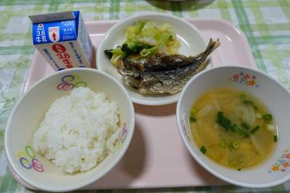 米飯、牛乳、アジの干物、キャベツと小松菜のおひたし、豆腐と大根の味噌汁