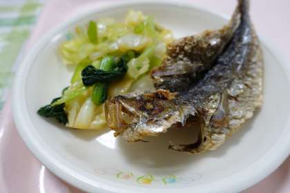 今日は沼津名産のアジの干物です。他にも、豆腐、葉ネギ、タマネギも地場産品です。