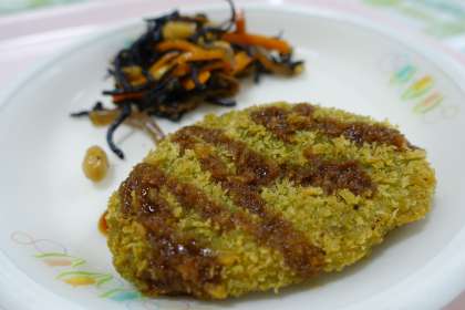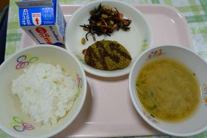 米飯、牛乳、黒はんぺんお茶フライ、ひじきと大豆の煮物、豆腐ともやしの味噌汁