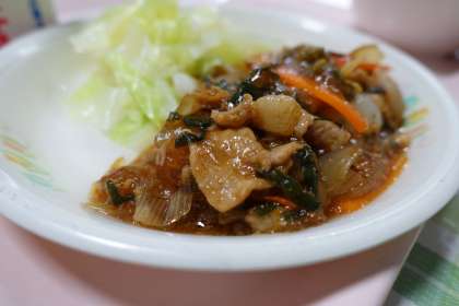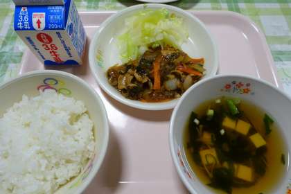 米飯、牛乳、スタミナ焼肉、ボイルドキャベツ、わかめスープ