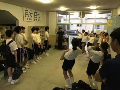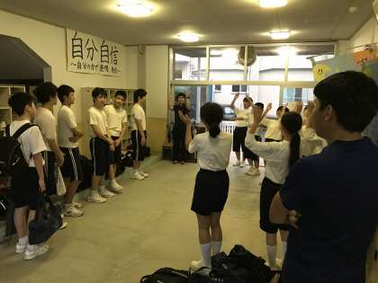 総合男女バレーボール部を中心に、玄関で男子バスケットボール部にエールをおくりました。