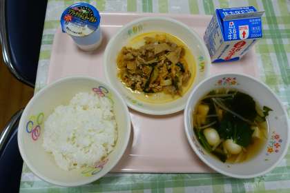 米飯、牛乳、豚キムチ、ワカメスープ、ヨーグルト
