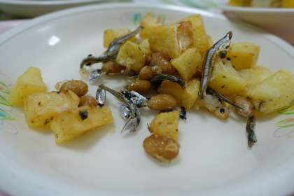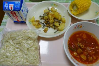 ソフト麵、牛乳、つけナポリタン、ポテトと小魚の唐揚げ、ゆでトウモロコシ