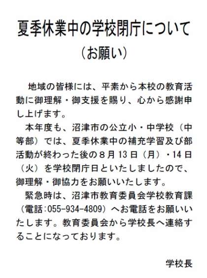 ご了承ください。なお、緊急の場合は、沼津市教育委員会学校教育課までご連絡を御願いいたします。