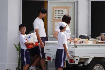 運ばれてきた古紙等は、一時、小屋へ入れます。テニス部の生徒が率先して手伝ってくれました。