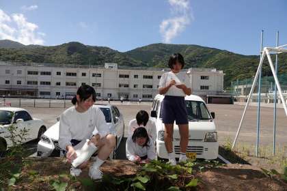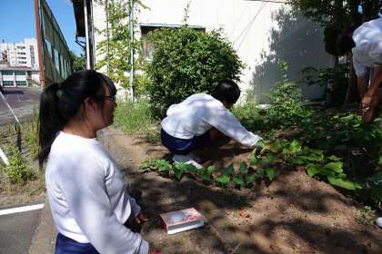 3年生がサツマイモ畑で、イモの生育状況を観察していました。