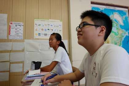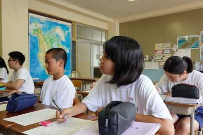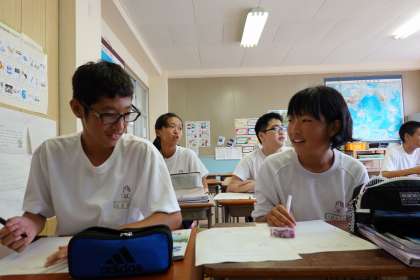 友達に綴りをきいたり、渡部先生に英語で尋ねたりして、作文を書いています。