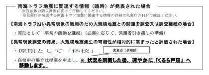 本日、お子様を通じて「警報等発表時の対応」の改訂版を配布しました。