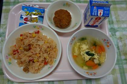 ジャンバラヤ、牛乳、かぼちゃのチーズフライ、たまごと小松菜、アーモンド小魚