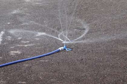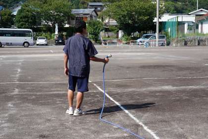 スプリンクラー設備がないため、簡易式の散水器も用いています。