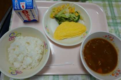 米飯、牛乳、カレーライス、チーズオムレツ、ボイルドサラダ