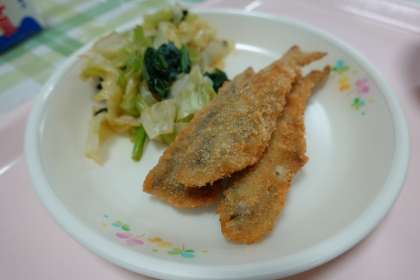 米飯、牛乳、肉じゃが、小イワシフライ、キャベツと小松菜のおひたし