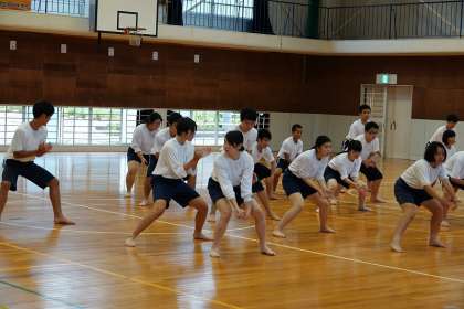 体育で確認してきた動きを、全体で合わせていきます。