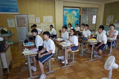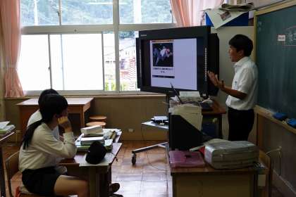 電子黒板を使って、英語で紹介をしながら、楽しそうに話す渡部先生です。