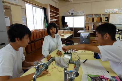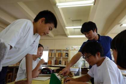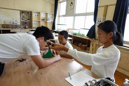 豆電球、乾電池を直列・並列につなぎ、回路に流れる電流を計測します。
