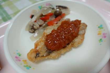 食パン、牛乳、ホキのチリソース、きのこソテー、たまごスープ