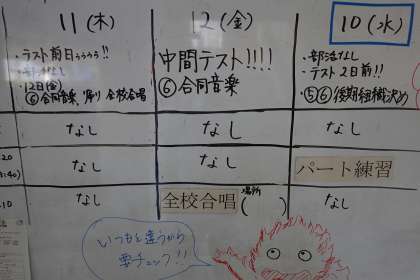 連合音楽会に向けた練習予定と共に、中間テストの予定が・・・。