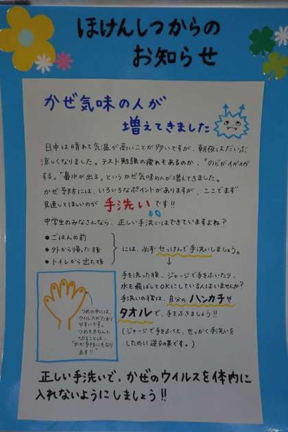 保健室からのお知らせをしっかり読んで、風邪予防を実践してほしいと思います。