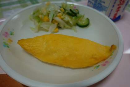 ロールパン、牛乳、ビーフシチュー、オムレツ、ボイルドサラダ