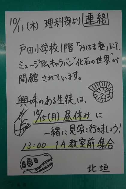 興味のある生徒の皆さんも、「化石かあ・・・」と、どこかで思った皆さんも、月曜日に一緒に見に行きましょう!