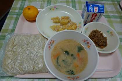 中華麺、牛乳、担々麺、ポテトと大豆の唐揚げ、果物