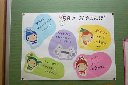 お子さんに、カードを配布しています。ご家庭でも、メディア利用の時間や約束を話題にして、自らよりよい関わりができるようにお話ください。