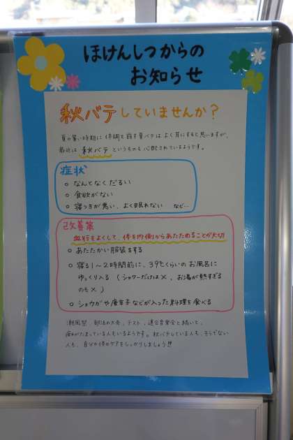 夏休み明けから、小中合同運動会、文化の部、スポーツ祭、連合音楽会・・・と駆け抜けてきました。疲れがたまっている生徒も・・・。バランスよく食べ、質のよい睡眠をとり、「充実の秋」になるようにご家庭でも、ご協力をお願いします。