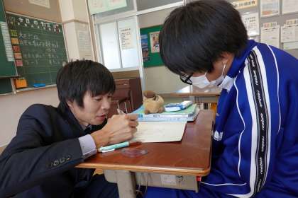 富永先生は、生徒の考えを確認し、支援をしています。
