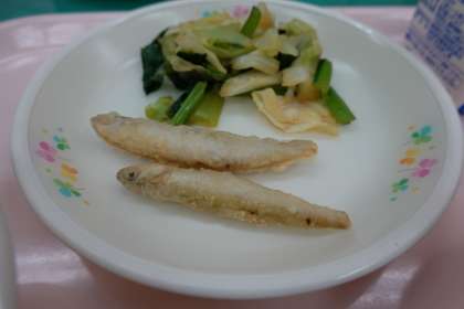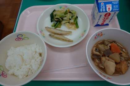 米飯、牛乳、芋煮、ワカサギのフリッター、おひたし
