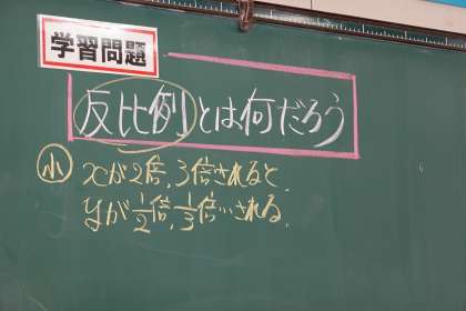 富永先生は、反比例について生徒が学習してきたこと、定着の様子を生徒の反応から確認し、中学の学習内容に入ってくださいました。