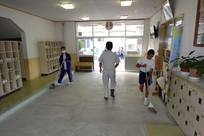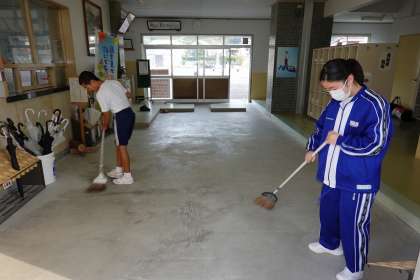 委員会の生徒が玄関をきれいに掃いてくれています。