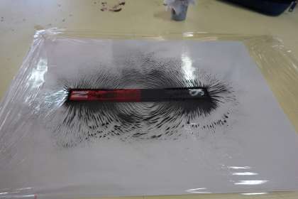 磁石の上に砂鉄をまいて、磁力線を観察します。
