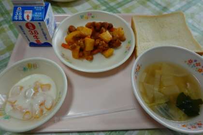 食パン、牛乳、鶏肉の五色揚げ、野菜スープ、ヨーグルトサラダ