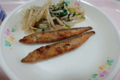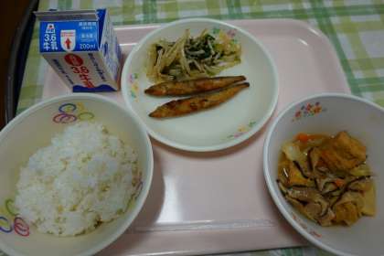 米飯、牛乳、ジャージャンドウフ、シシャモの竜田揚げ、ナムル