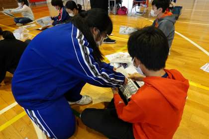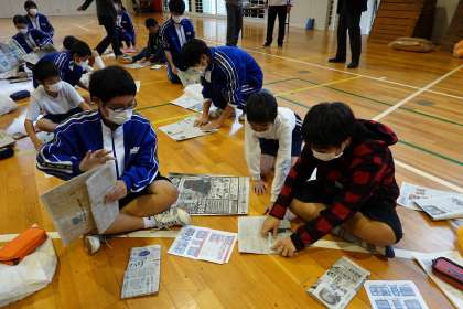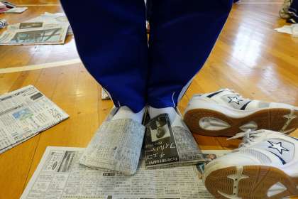 新聞紙でスリッパ作りです。
