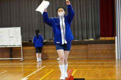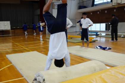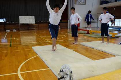 男子は、側方倒立回転跳びや前方回転跳びを練習しています。