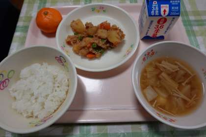 米飯、牛乳、肉じゃが、うすくず汁、果物(みかん)