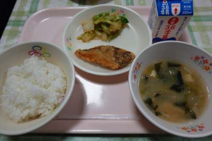 米飯、牛乳、ホキの唐揚げ、辛子和え、豆腐とタマネギの味噌汁