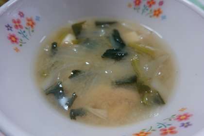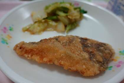 今日はタマネギがとっても甘い味噌汁に、からしの風味の辛子和え、さくさくのホキ・・です。