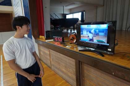 跳び方をタブレットで撮影し、その映像をテレビに飛ばして映しています。