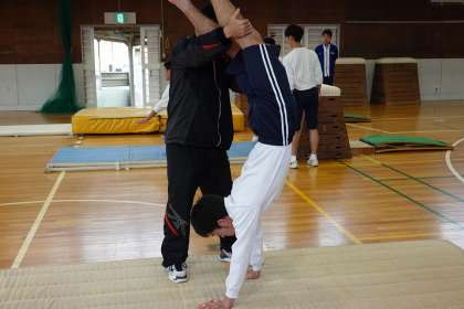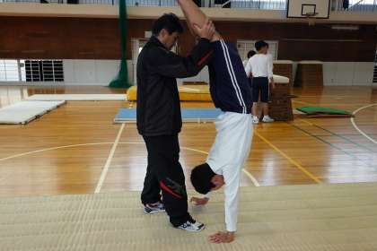 マットでは、逆立ち歩きの練習です。