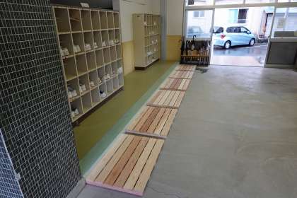 来年度、小学生が利用するに当たり、土足から履き替えやすい場所が必要です。