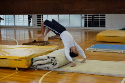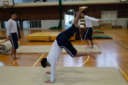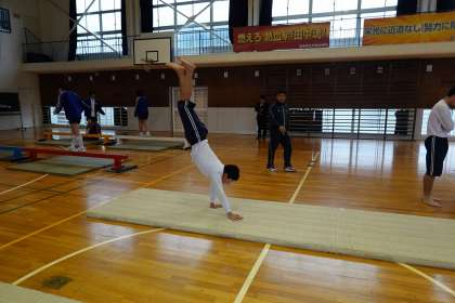 マットでは、前方倒立回転や倒立での歩行を練習し、互いに技を見合いました。