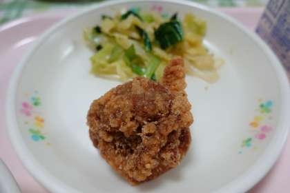 米飯、牛乳、鶏肉の更紗揚げ、キャベツと小松菜のおひたし、豆腐とワカメの味噌汁