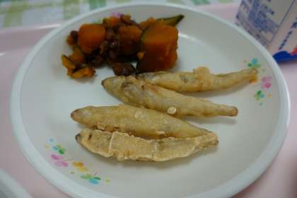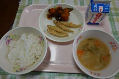 米飯、牛乳、わかさぎのフリッター、カボチャのいとこ煮、里芋と根菜の味噌汁