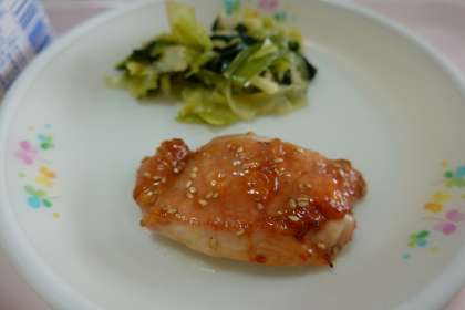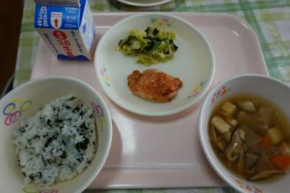 わかめご飯、牛乳、鶏肉の照り焼き、野菜いため、のっぺい汁